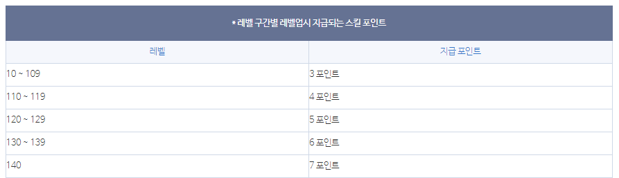 ■ 101레벨 부터는 레벨업 시 레벨의 끝자리가 0, 3, 6, 9인 경우 SP를 2배 획득