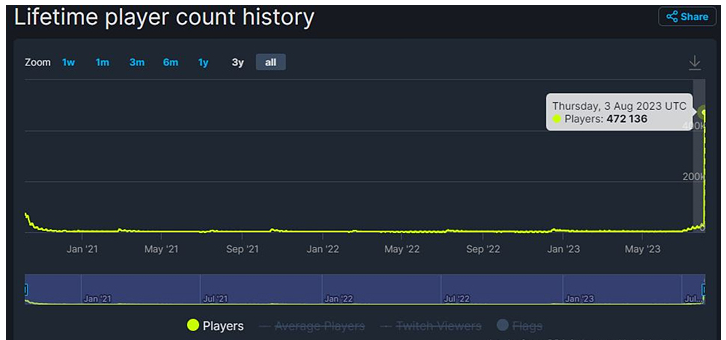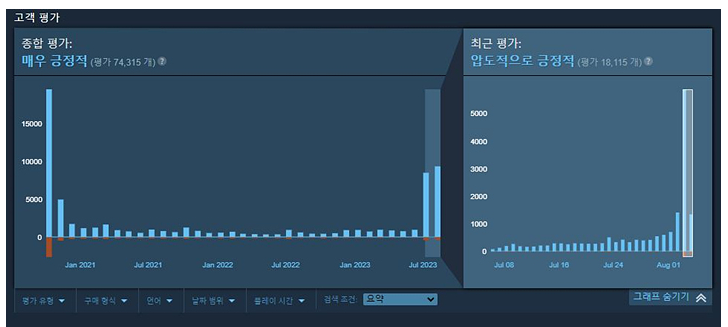 액트 1 이후 스토리가 개방되고, 파고들 요소가 더 늘어나는 등 정식 출시로 인해 제대로 즐길 준비가 되자 많은 사람들이 게임을 플레이하며 출시 하루 전, 2만 명대였던 유저 수가 4일 기준 47만 2,135명으로 역대 최대 동시접속자 수를 기록했답니다. 이는 스팀 전체 역대 최대 동시접속자 16위로, 어몽어스나 데스티니 가디언즈, 몬스터 헌터 라이즈를 크게 웃도는 기록이기도 합니다.