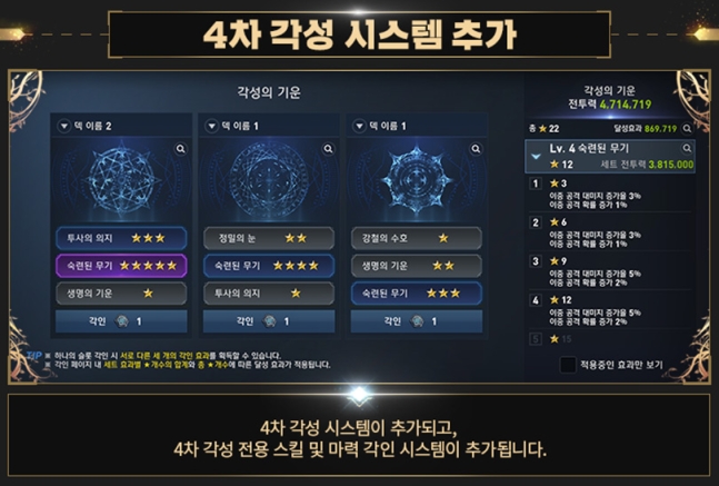 4차 각성에서 가장 크게 바뀌는 부분은 4차 각성 스킬과 신규 성장 콘텐츠 개방입니다. 500 레벨 이상, 3차 각성을 마친 캐릭터는 누구나 4차 각성 퀘스트를 시작할 수 있습니다. 각성 완료 시 스킬 슬롯 1개가 추가로 열려 총 9개의 스킬 슬롯을 활용할 수 있으며, 각 클래스의 직군에 맞는 4차 각성 스킬을 자동으로 획득합니다. 4차 각성 스킬은 화려한 스킬 이펙트는 물론, 궁극기에 비해 짧은 쿨타임과 강력한 스킬 효과를 갖춰 활용도를 높였습니다.
