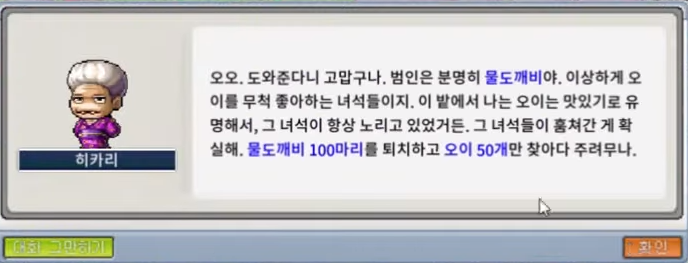 그다음은 물도깨비 100마리를 퇴치하고 오이 50개를 가져다 달라고 합니다.