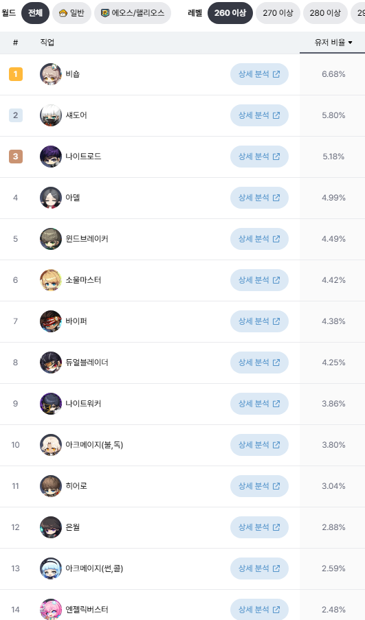 이 순위는 ‘260레벨 이상’ 고레벨 유저 기준이기 때문에, 복귀 유저나 초보자 입장에선 다소 다르게 느껴질 수 있습니다. 하지만 상위권 유저들이 어떤 직업을 선호하는지 참고하시는 데에는 충분한 가치가 있다고 생각합니다.