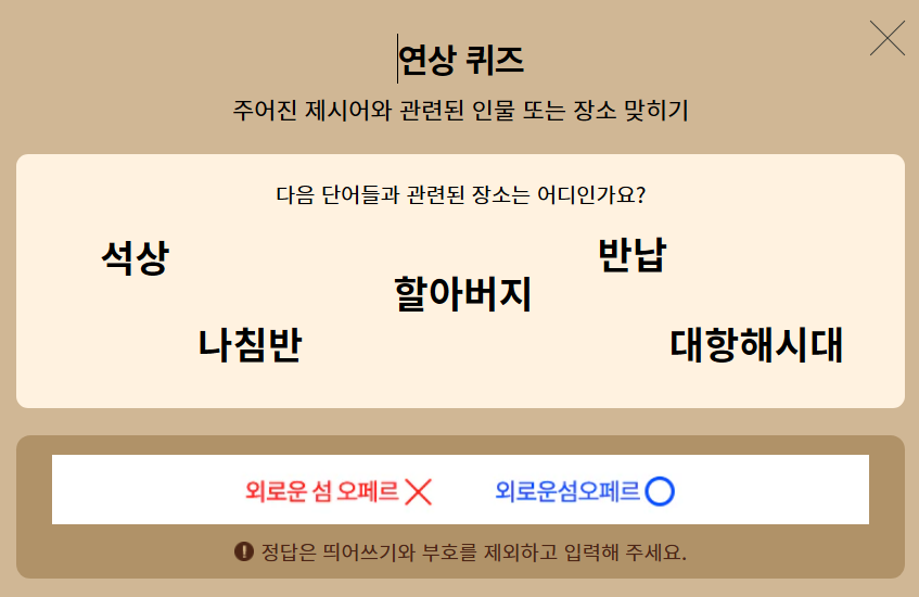 퀴즈는 초성, 이미지, 연상, 장면, OST의 다섯 가지 유형으로 구성되어 있습니다. 정답을 입력할 때는 띄어쓰기나 문장 부호 없이 입력해야 합니다.