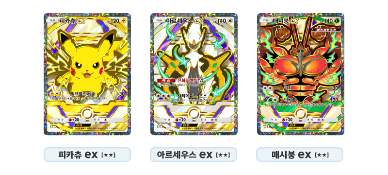 이번 하이클래스팩 ex는 과거 출시된 「최강의 유전자(A1)」부터 「하늘과 바다의 인도(A4)」까지의 카드를 대거 재수록한 점이 가장 큰 특징입니다. 특히 특정 ♦♦♦♦ 카드는 등장했던 모든 버전이 전부 수록되었으며, 일부 카드는 미러 사양의 홀로그램으로 화려하게 다시 등장합니다. 또한 새로운 일러스트가 적용된 카드도 포함되어 있어 기존 유저는 물론 신규 플레이어에게도 소장 가치를 높여줍니다.