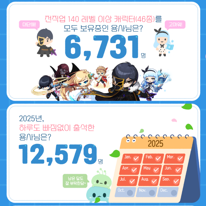 이처럼 풍성한 이벤트 뒤에는 메이플스토리M이 쌓아온 견고한 역사가 있습니다. 지난 9년 동안 139회의 정기 업데이트를 진행했으며, 1주년부터 꾸준히 플레이해 8종의 기념 이펙트를 모두 보유한 유저는 135명에 달합니다. 또한, 2025년 한 해 동안 하루도 빠짐없이 출석한 유저가 12,579명에 이른다는 통계는 유저들의 헌신과 게임의 꾸준한 재미를 입증합니다.
