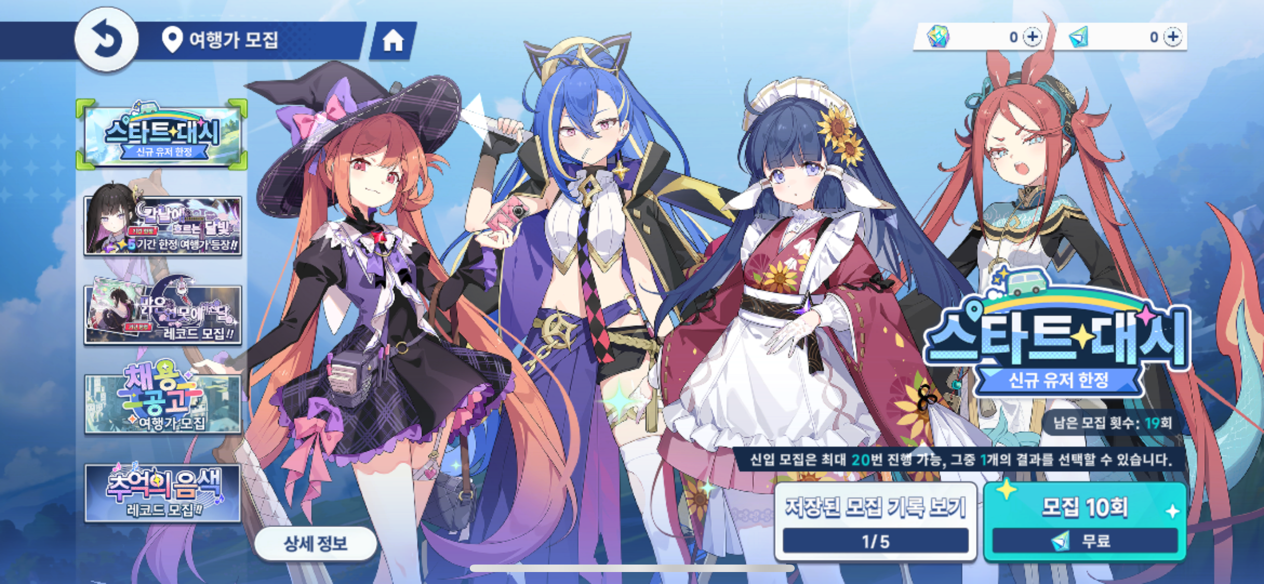 스텔라 소라는 기본적으로 스타트 대시 10연차를 최대 20회까지 진행할 수 있습니다. 이 과정에서 최대 5개의 결과를 저장하고, 그 중 마음에 드는 조합을 선택하는 시스템이기 때문에 다른 게임처럼 리세마라를 필수로 하지 않아도 됩니다.