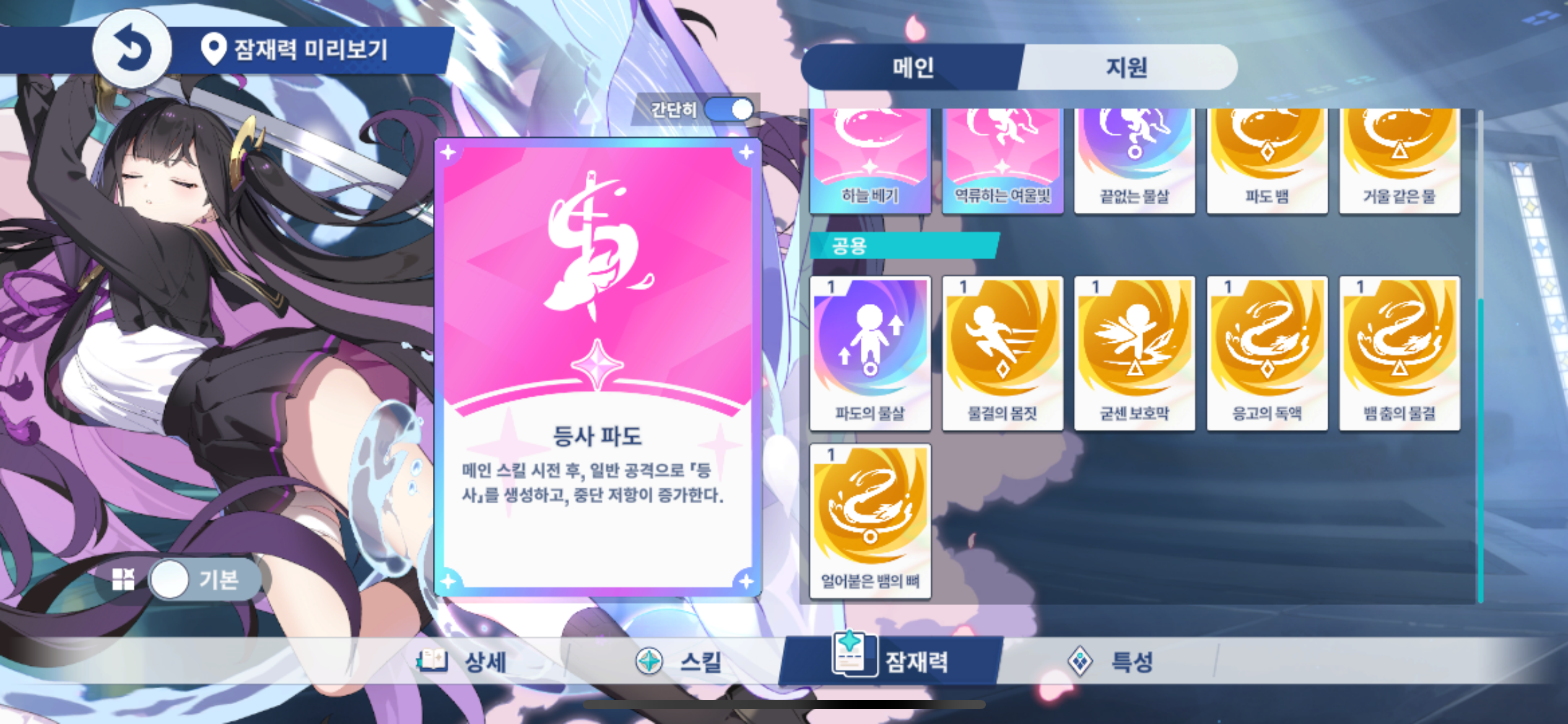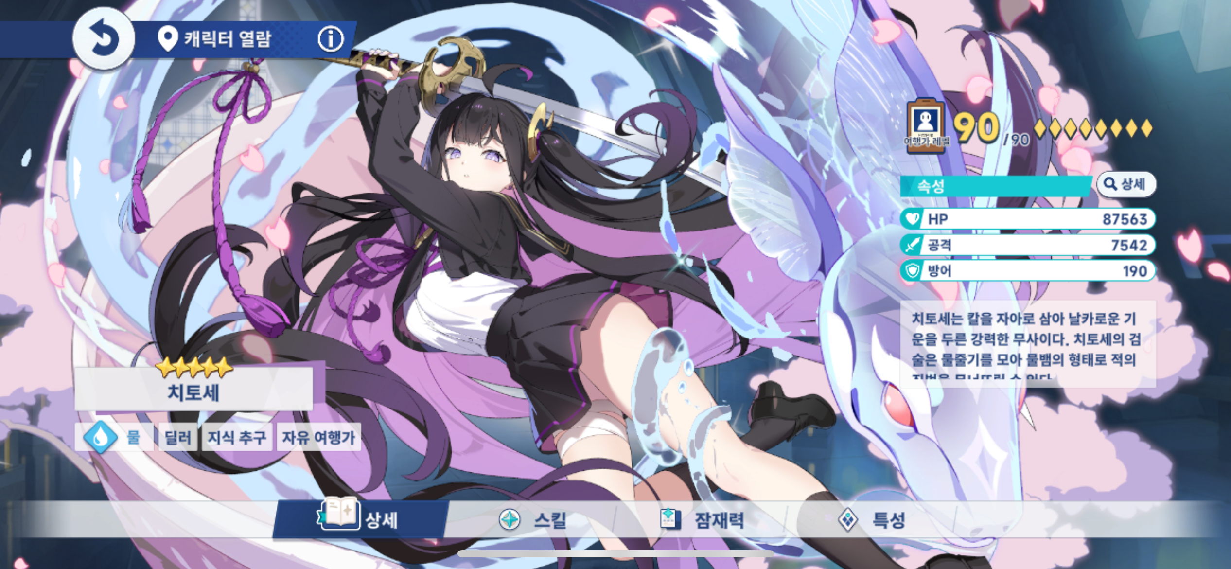 그녀를 중심으로 같은 속성의 프리지아, 테레사와 함께 조합하면 안정적인 물속성 파티를 구성할 수 있죠.