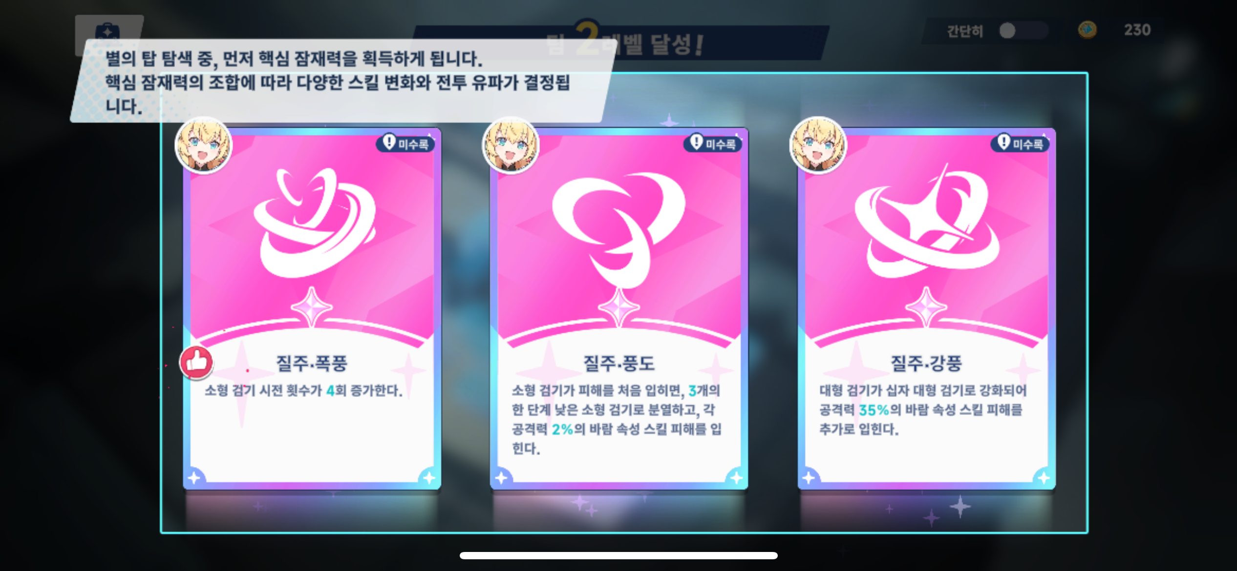 또한 전투 중 랜덤 버프 선택 요소가 있어 로그라이크식 전략성도 함께 느낄 수 있죠.