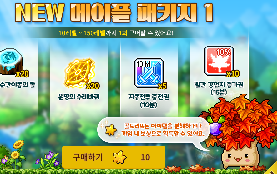 메이플 패키지 구매: 골드리프는 얻기 쉬운 재화이니, 150레벨까지 구매 가능한 이벤트 패키지(1, 2, 3)를 놓치지 마세요. 경험치 쿠폰, 자동 전투 충전권 등을 제공합니다.