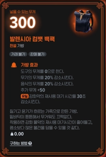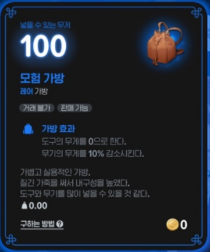 - 모험 가방: 도구 무게 0 + 무기 무게 10% 감소