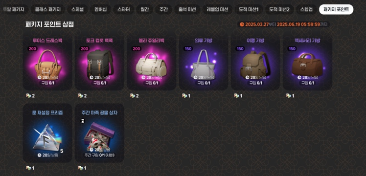또한 패키지 포인트로 구매 가능한 상위 등급 가방은 레어~전설 등급으로 분류되며, 일반 가방과는 비교할 수 없는 확장 폭을 제공합니다.