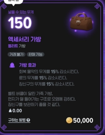 - 디자이너 가방: 패션 장비 무게 0 + 포션 무게 10% 감소