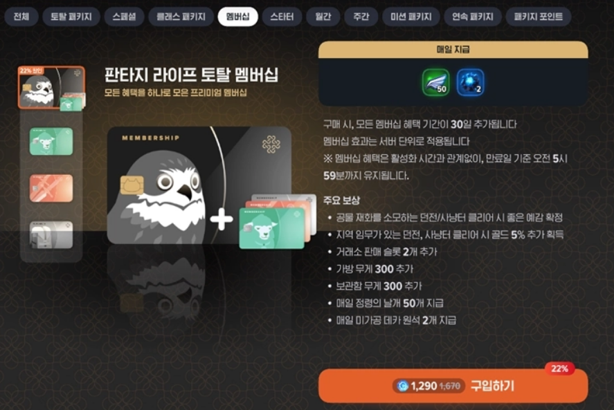 조금 더 여유가 있다면 미스틱 아르카나 토탈 패키지나 판타지 라이프 토탈 멤버십을 활용하는 것이 좋습니다.