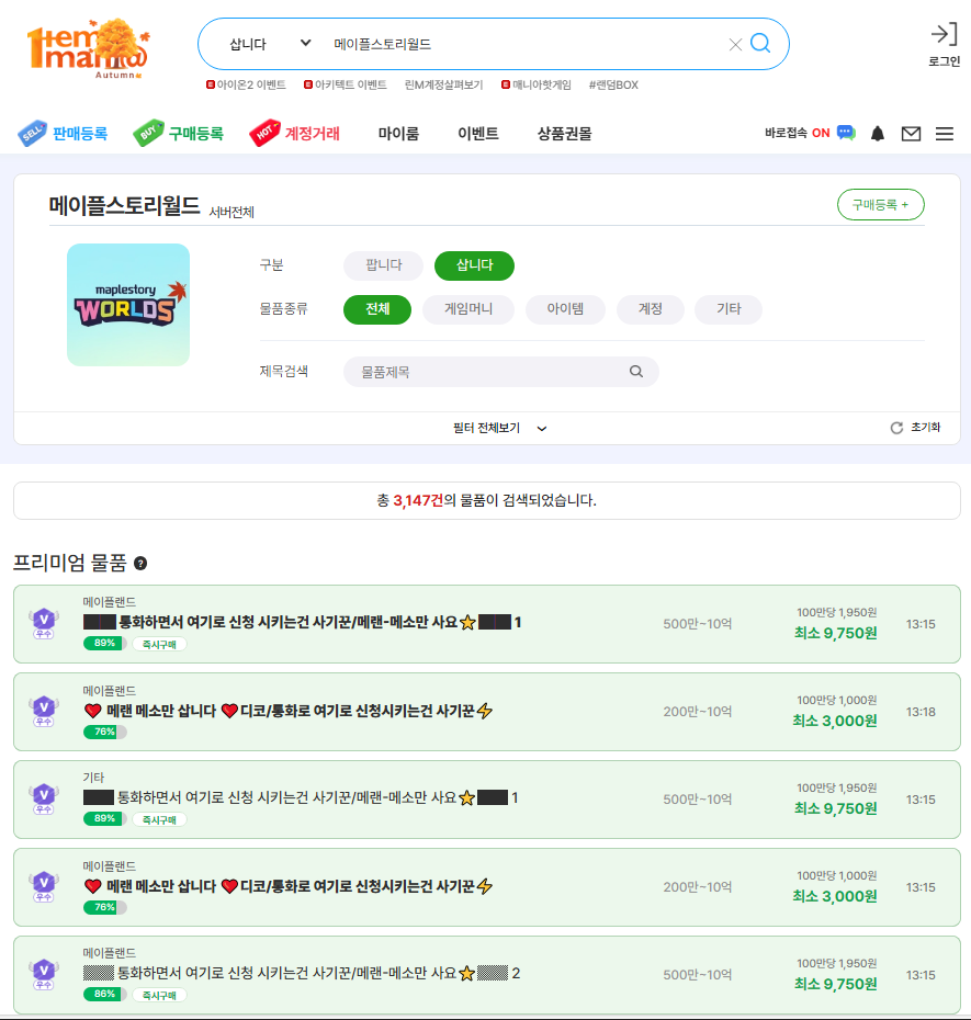 그래서 많은 유저들이 외부 거래 플랫폼을 통해 메소를 구입하는 방법을 고려하곤 하죠.