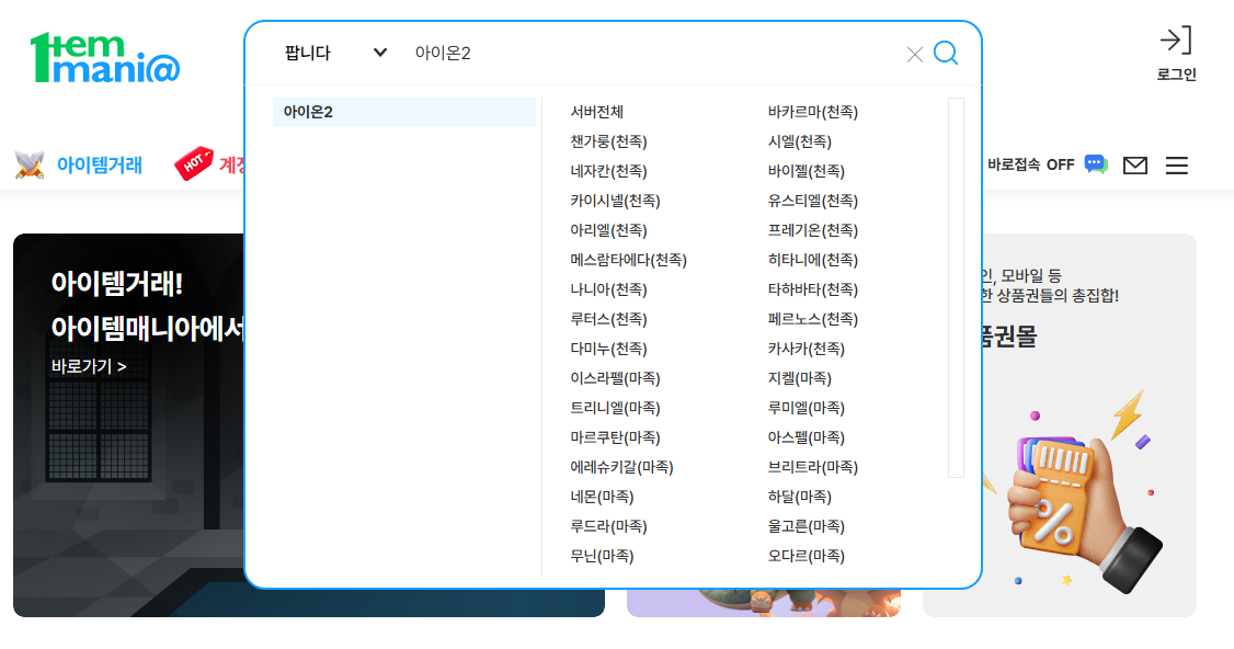 먼저 아이템매니아에 접속하면 상단 메뉴에서 아이온2 카테고리를 선택할 수 있습니다.