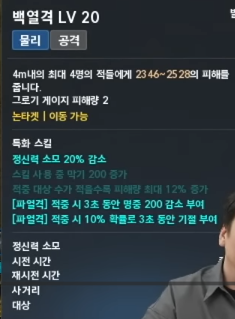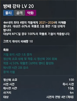 주요 스킬로는 여러 적을 속박하는 나포, 공격과 동시에 회복 및 보호 효과를 주는 비호의 일격, 방패 로 방어 후 반격하는 방패막기 등이 있습니다.