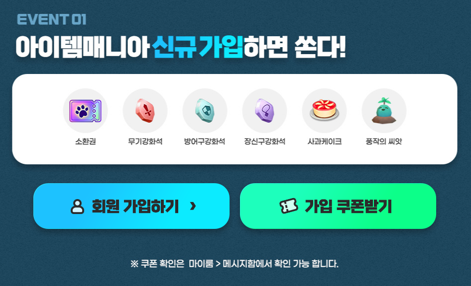 아이템매니아에 아직 가입하지 않으신 판타테일 유저분들을 위한 환영 이벤트입니다.