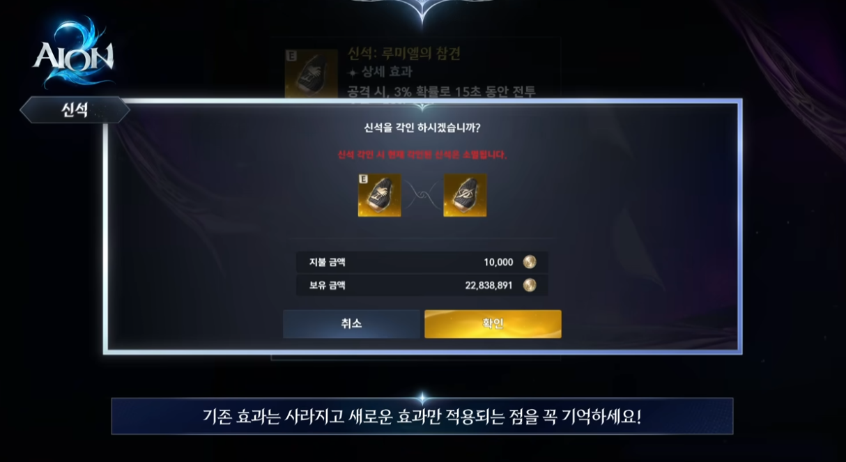 주의: 기존 장비에 더 강한 신석을 넣으면 기존 효과는 완전히 사라지고 새로운 신석 효과만 적용됩니다.