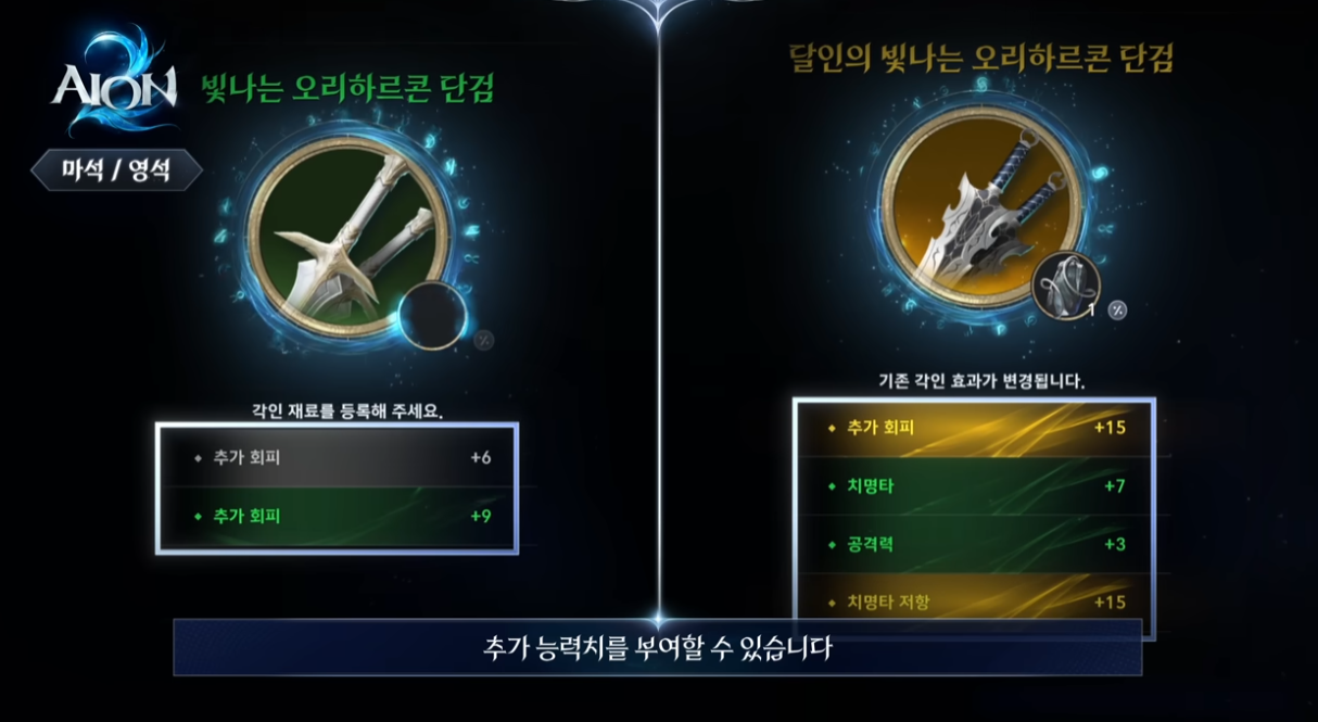 아이온2의 장비 성장은 강화만으로 끝나지 않습니다. 장비에 다양한 랜덤 옵션을 추가해 세부 세팅을 꾸밀 수 있습니다.