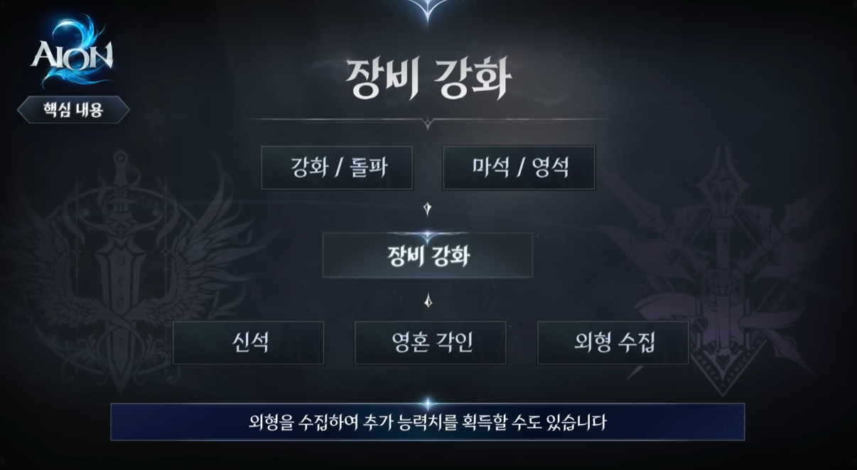 아이온2를 처음 시작하거나 전투력을 빠르게 올리고 싶은 유저를 위한 장비 강화 공략입니다. 강화·돌파, 마석·영석·신석, 영혼 각인, 외형 수집 효과까지 아이온2 성장 시스템을 자세히 정리했습니다.