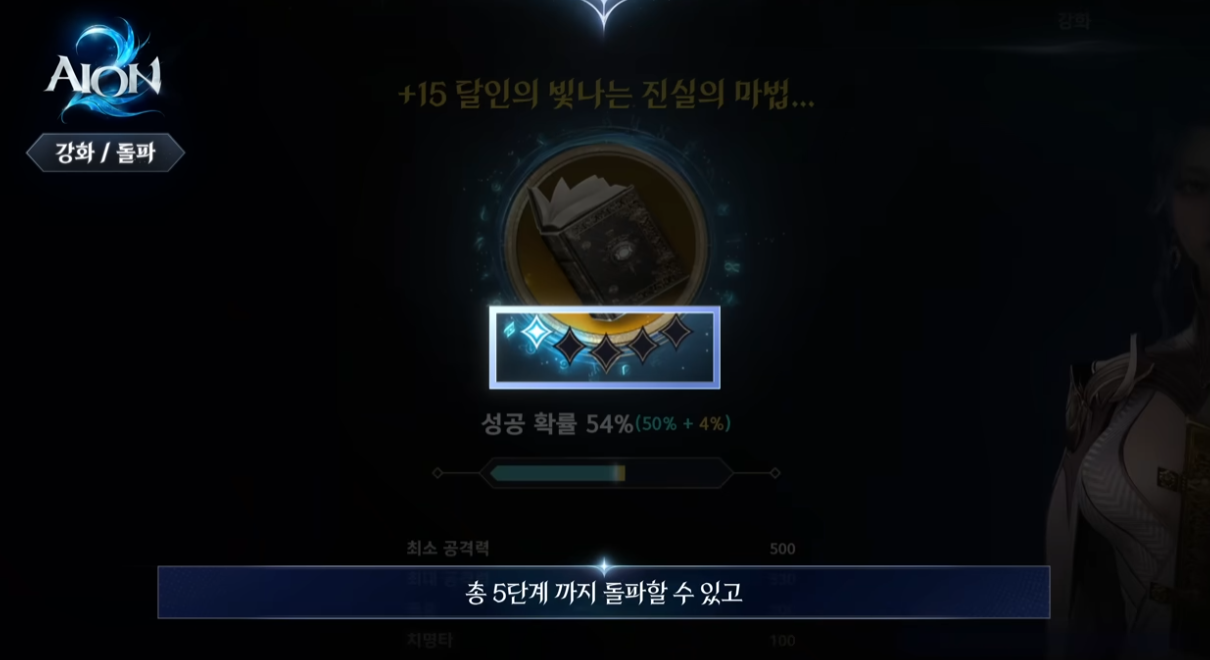 최대 5단계 돌파가 가능하며, 강화와 동일하게 실패해도 장비는 안전합니다.