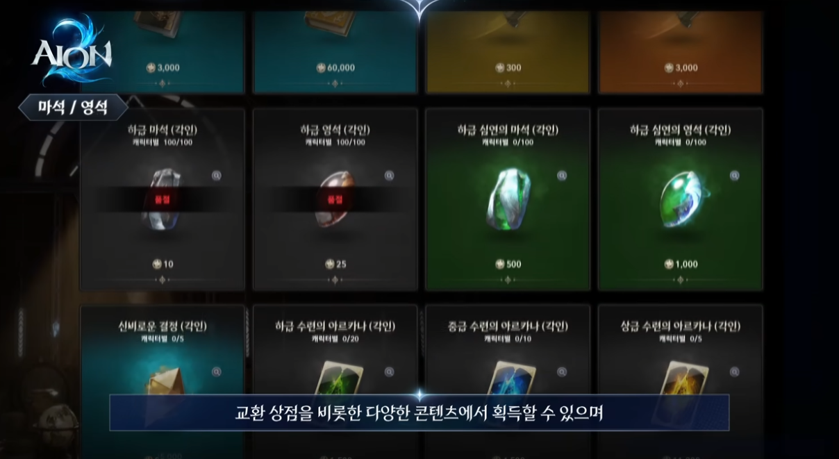 | 마석·영석 | 슬롯에 랜덤 옵션 부여, 연금 제작 가능 |