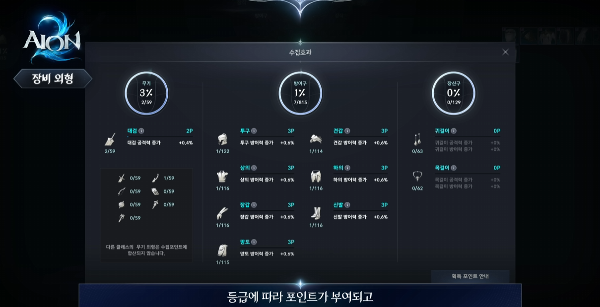 외형을 처음 획득할 때 등급에 따라 포인트가 쌓이고, 부위별로 추가 능력치 보너스가 적용됩니다.