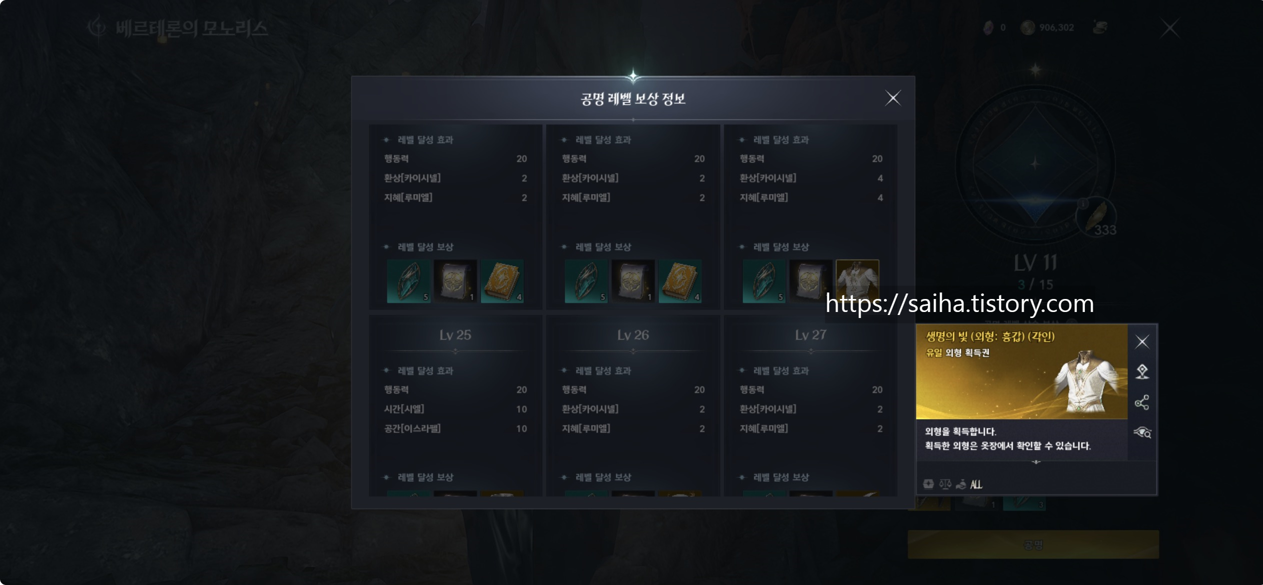 콘텐츠 최대 레벨: 30레벨 / 24레벨부터 유일/전설 외형 제공 / 스탯 상승폭이 커서 전투력 체감이 확실함 / 최종 단계에서는 ‘생명의 비스튬’ 등 외형 보상 제공 외형은 직접 적용했을 때 더욱 화려하게 보이며, 코스튬 선호도도 상당히 높은 편입니다.