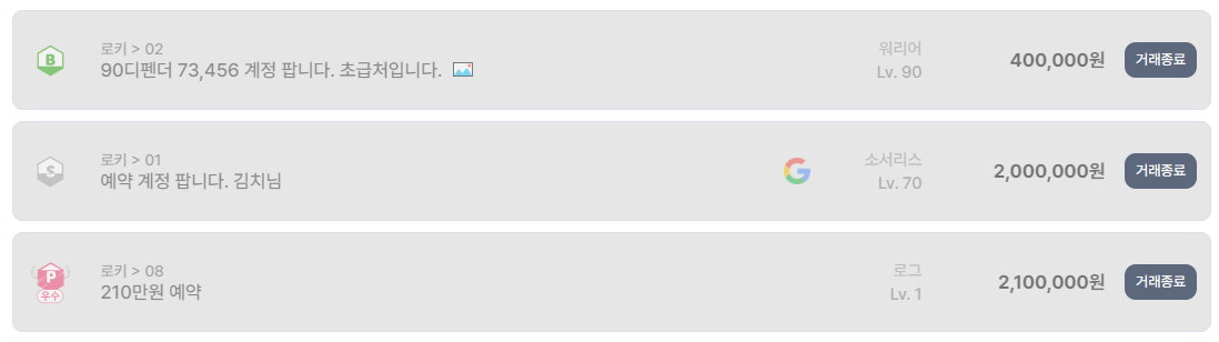 로키 서버 02에서 거래 종료된 워리어 계정은 레벨 90, 전투력 73,456임에도 불구하고 40만원이라는 낮은 가격에 판매되었다.