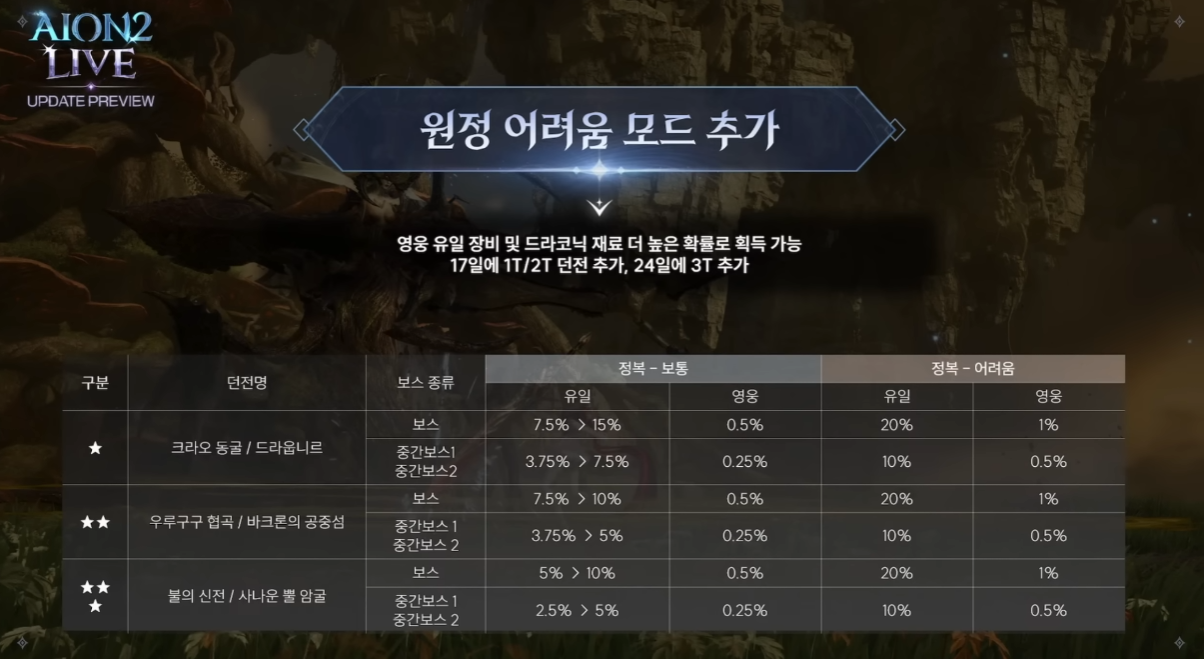 원정 '어려움' 모드 등장: 숙련된 파티를 위한 고난도 모드가 추가되어 더 높은 확률로 유일 장비와 드라코닉 재료를 수급할 수 있게 되었습니다.