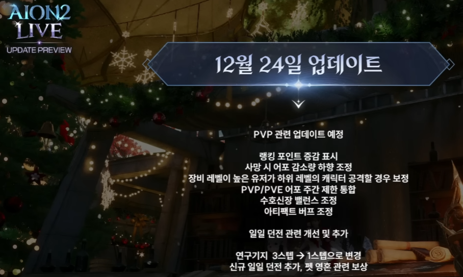 다가오는 12월 24일에는 어비스 포인트 개편 및 PvP 관련 대규모 업데이트가 예정되어 있습니다. 사망 부담을 줄이면서도 승리의 성취감을 극대화할 수 있는 방향으로 조율 중이라고 하니, 이번 패치로 기본 체급을 다져놓고 다음 주를 맞이하는 것이 좋겠습니다.