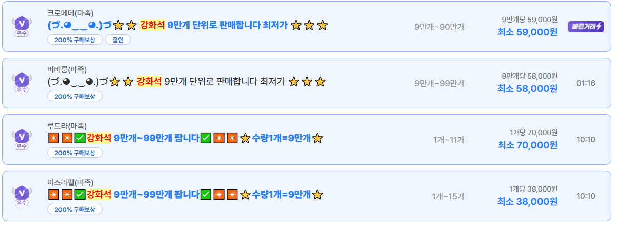 서버별로 큰 차이는 없지만,바바룽·시엘 서버 일부 판매자는 9만개당 58,000원까지 내려가며 빠른 소진을 노리는 모습도 보입니다.