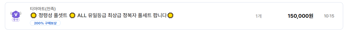살성, 궁성, 정령성 등 인기 직업의 유일 등급 정복자 풀세트는 현재 15만 원 선에서 다수의 서버에서 동시에 거래 중입니다.