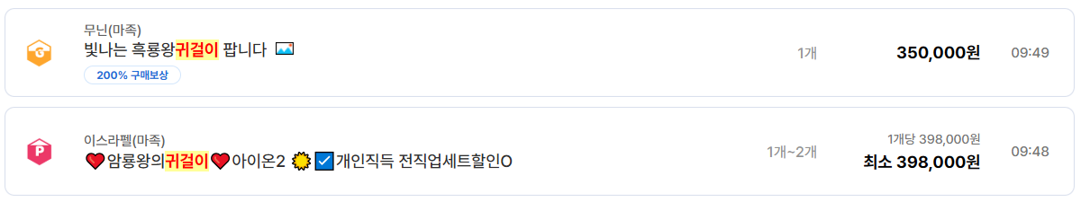 이 가격대는 신규 유저나 부캐 육성 유저에게 매우 매력적인 구간으로, 직접 파밍 대비 시간 효율이 압도적이기 때문에 거래 회전율이 빠른 편입니다. 실제로 동일한 가격의 매물이 여러 서버에서 동시에 등록되어 있는 점이 이를 증명합니다.