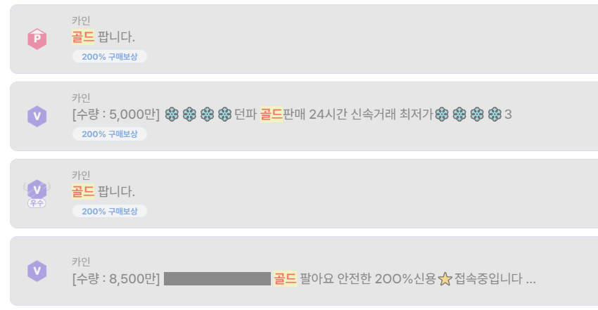 “최저가”, “24시간”, “200% 구매보상”, “안전 골드” 같은 문구가 반복된다.