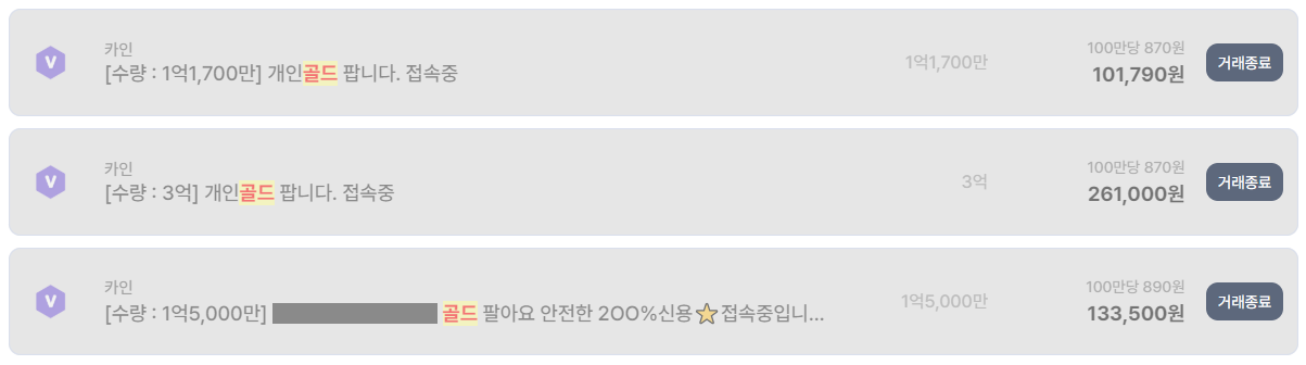 하지만 실제 거래 종료 내역을 보면, 등록가는 다소 높아도 실제 거래는 대부분 870~890원 선에서 성사 개인 골드, 사냥 골드, 급처 물량은 빠르게 거래 종료 즉, 광고 문구보다 중요한 건 단가와 수량이라는 점이 다시 한 번 확인된다.