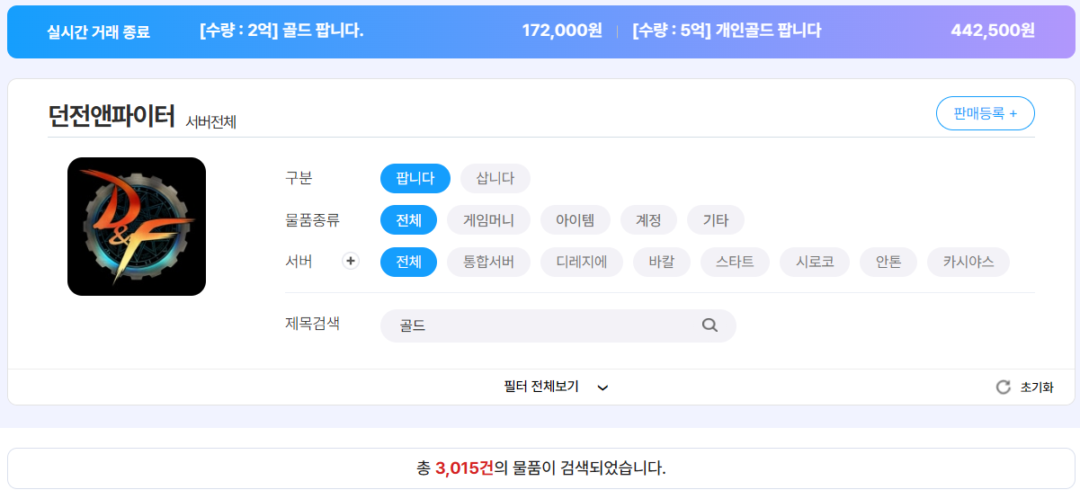 최근 아이템매니아에 등록되고 실제로 거래된 골드 거래 내역을 살펴보면, 현재 던파 골드 시장의 흐름이 꽤 명확하게 보인다.