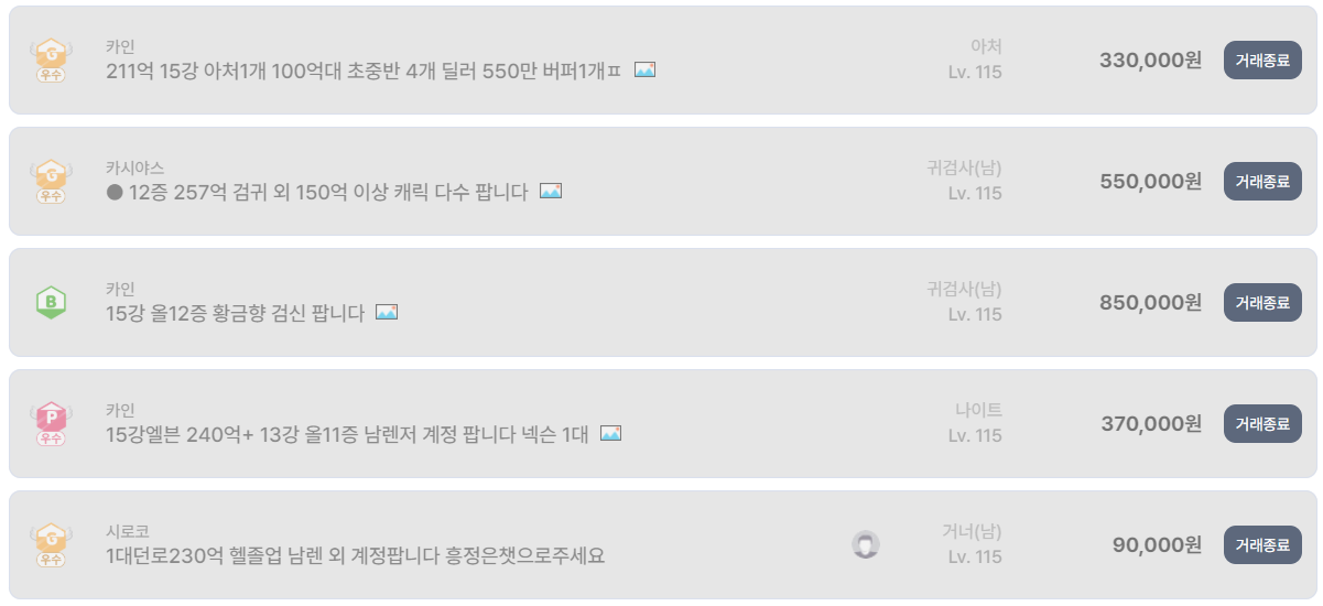 아이템매니아 거래 종료 리스트에서도 7만~15만 원대 계정들이 짧은 시간 안에 종료된 사례가 반복적으로 확인된다.