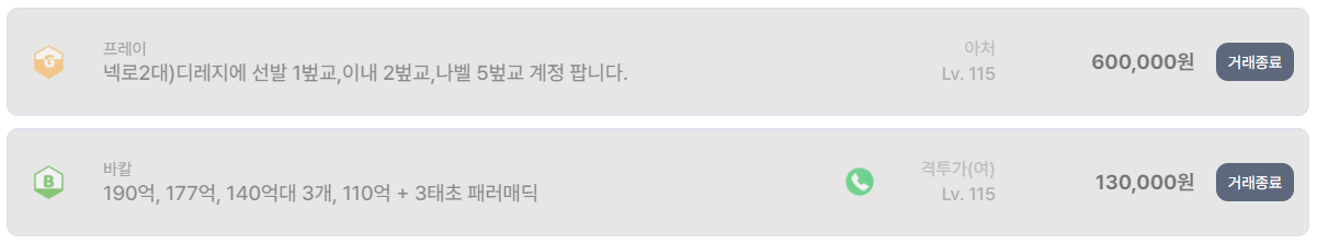 카인, 프레이, 바칼 서버를 중심으로 200억~300억 딜러를 2~5캐릭 이상 보유한 계정들이 30만~60만 원대에 다수 등록되어 있으며, 일부는 빠르게 거래 종료되었다.
