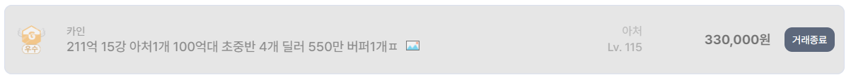 실제로 아이템매니아 거래 종료 목록을 보면 200억대 딜러 + 고스펙 버퍼 1캐릭 조합 계정이 30만 원대 초반에 거래된 사례도 확인된다. 신규 또는 복귀 유저 입장에서 바로 레이드 진입이 가능하다는 점이 크게 작용한 결과다.