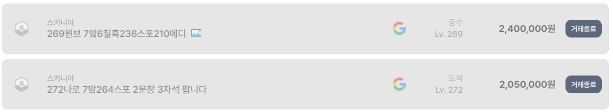 눈여겨볼 부분은 최상위 초고가 계정이다. 275레벨 이상, 올아케인, 칠흑, 문장 완성급 계정은 700만 원에서 많게는 1,000만 원 이상 가격으로 거래 종료된 사례도 확인된다. 이 구간은 단순 플레이 목적이 아닌, 서버 내 경쟁과 랭킹 유지, 혹은 장기 플레이를 전제로 한 구매자들이 형성하는 시장이다. 거래 수는 적지만, 가격 방어력은 상당히 높은 편이다.