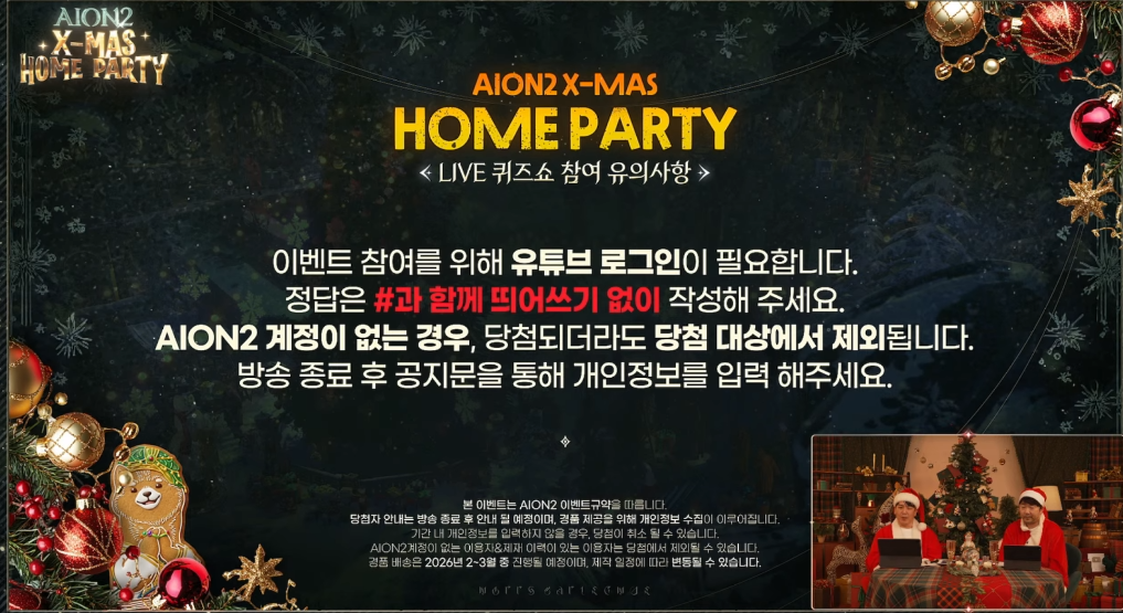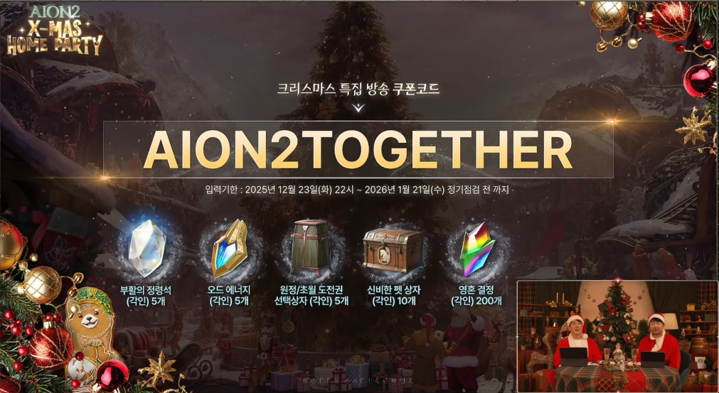 아이온2 크리스마스 특집 라이브 방송에서 공개된 쿠폰 코드 AION2TOGETHER 보상과 등록 방법, 크리스마스·신년 우편 보상까지 한 번에 정리했습니다. 기간 한정 쿠폰이니 놓치지 마세요.