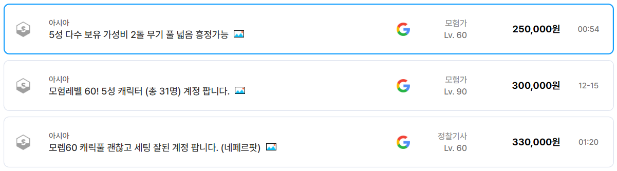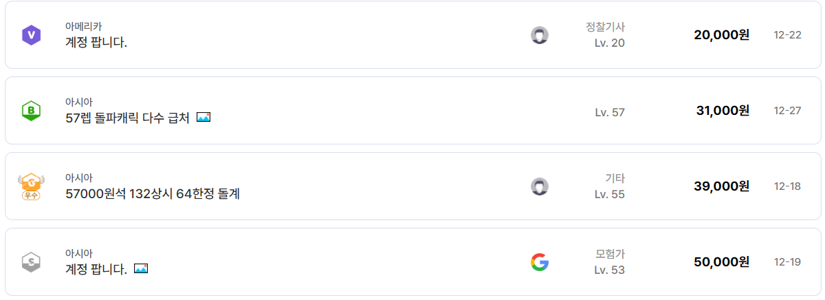 특히 눈에 띄는 부분은 ‘급처’, ‘흥정 가능’이라는 문구가 붙은 매물이다. 같은 조건의 계정이라도 급처로 나온 계정은 3만 원대부터 시작하는 초저가 매물도 확인된다. 예를 들어 57레벨 돌파 캐릭터 다수 보유 계정이 31,000원에 등록된 사례는, 빠르게 시작하고 싶은 복귀 유저에게는 상당히 매력적인 선택지다. 반면 풀돌, 풀재련 계정은 여전히 고가를 유지하고 있으며, 100만 원을 넘어 900만 원대까지 형성된 종결 계정도 아이템매니아에서 실제로 거래되고 있다.