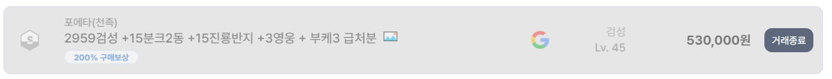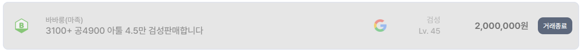 - 내실 완성도: 내실이 잘 되어 있는 계정은 거래 시 더 높은 가격에 팔리고 있으며, 고레벨 캐릭터와 강화된 장비가 함께 판매될 때 가격이 급등하는 경향을 보입니다. 예를 들어, 분크메, 영웅 장비 등이 내실로 포함된 계정은 500,000원 이상의 가격을 기록했습니다.