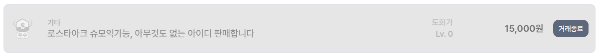 가장 하단 가격대부터 살펴보면, 아무 캐릭터 육성이 되지 않은 계정도 거래가 이루어지고 있다는 점이 눈에 띈다. 슈모익 적용이 가능한 빈 계정이 1만 5천 원에 거래 종료된 사례는, 로스트아크 계정 거래가 단순한 ‘스펙 판매’가 아니라 이벤트 활용 가치까지 포함하고 있음을 보여준다. 신규 이벤트 시즌에는 이런 깡통 계정도 빠르게 소화되는 경향이 있다.