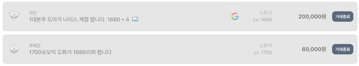 본격적인 도화가 시세는 1680~1700 구간에서 형성된다. 아만 서버의 1689 도화가 계정은 20만 원에 거래 종료되었는데, 해당 계정은 1대 본주 계정이라는 점과 1680대 캐릭터 4개 보유라는 구성 덕분에 가격 방어에 성공했다. 반면 루페온 서버의 1700 슈모익 도화가 + 1686 리퍼 계정은 6만 원이라는 비교적 낮은 가격에 거래가 종료되었다. 서버 차이보다는 캐릭터 구성 대비 실질적인 레이드 투입 가치가 낮았기 때문으로 해석된다.