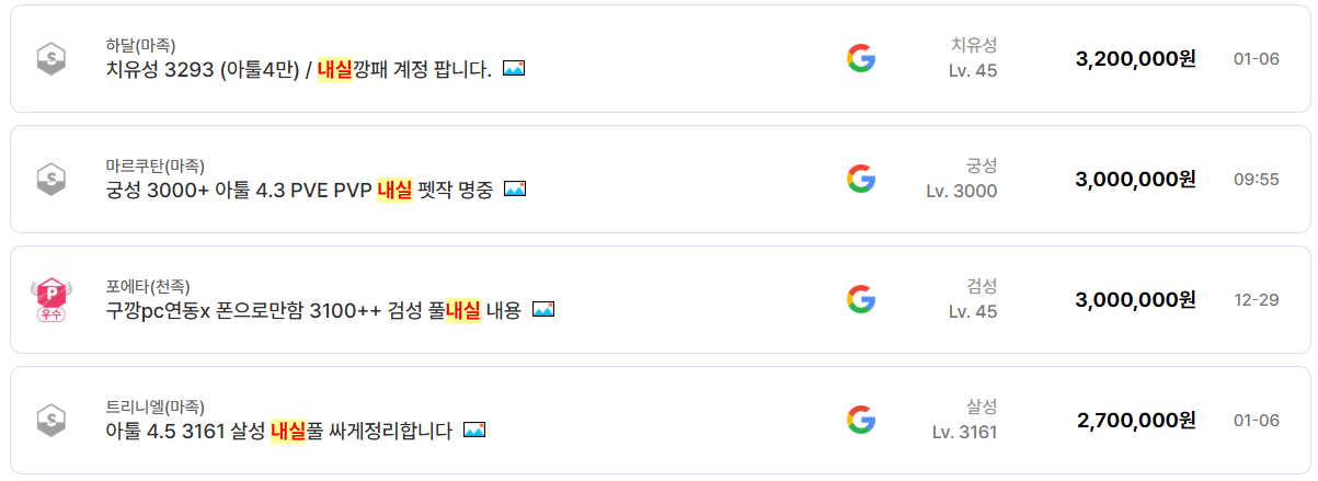 흥미로운 점은 아툴 수치와 내실 요소의 가격 영향력 증가다. 과거에는 전투력 숫자만 높아도 거래가 성사됐지만, 최근에는 펫작, 도감, 돌파 수치, 영혼 각인, 아르카나 단계까지 꼼꼼히 완성된 계정이 빠르게 소진된다. 실제로 아툴 5만 이상, 펫작 완료, 내실 ‘완’으로 표기된 계정들은 평균보다 높은 가격임에도 거래 속도가 매우 빠르다.