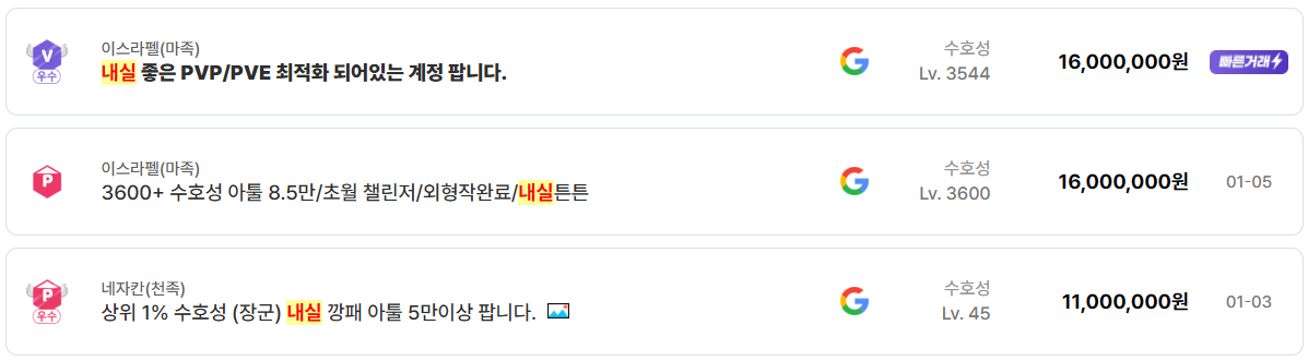 수호성은 안정적인 수요가 유지되고 있다. 3,500 이상 고스펙 수호성 계정은 1,600만 원 전후, 3,000 초중반대 풀내실 계정은 1,000만 원 중반대에 형성돼 있다. 특히 네자칸 서버 천족 상위 1% 수호성 계정이 1,100만 원에 거래된 점을 보면, 서버 프리미엄보다는 ‘장군 이상 랭크, 아툴 수치, 영각 및 아르카나 완성도’가 더 중요한 판단 요소로 작용하고 있음을 알 수 있다.