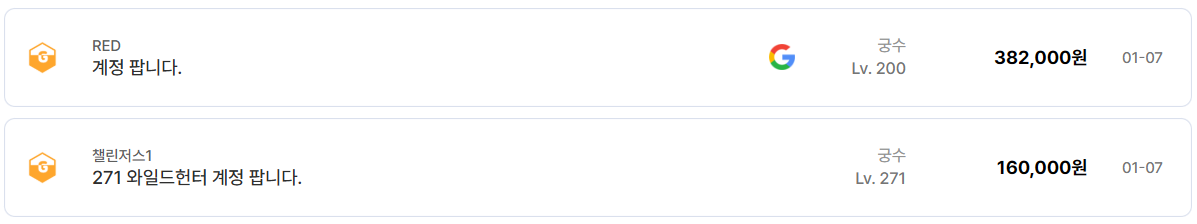 가장 먼저 눈에 띄는 것은 레벨 대비 가격 격차다. RED 서버 궁수 레벨 200 계정이 38만 원에 거래된 반면, 챌린저스1 서버의 271 와일드헌터 계정은 16만 원 수준에 형성돼 있다. 단순 레벨보다 서버 환경과 계정 구성, 그리고 내실 요소가 가격에 더 큰 영향을 미친다는 것을 보여준다. 특히 와일드헌터는 특정 콘텐츠에서 효율은 좋지만, 범용성 면에서는 선호도가 갈리는 직업이라 가격이 상대적으로 낮게 형성되는 경향이 있다.