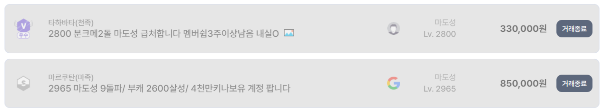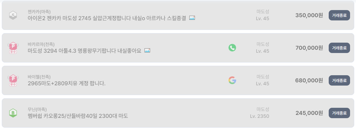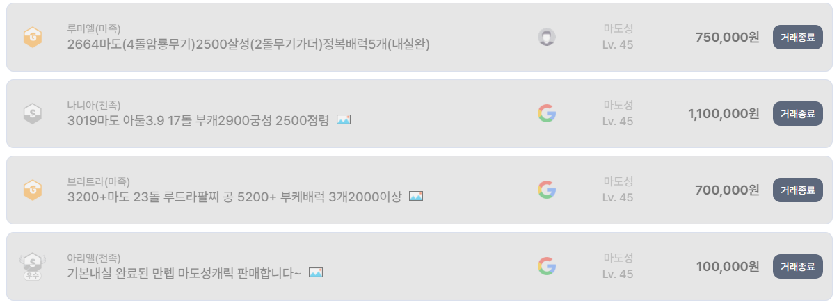 흥미로운 부분은 저가 구간의 꾸준한 수요다. 마도 1900~2300대의 초중반 계정도 10만~20만 원 선에서 반복적으로 거래 완료되고 있다. 신규 복귀 유저나 서브 계정 수요가 여전히 존재한다는 의미다. 특히 닉네임이 짧거나, 구글 깡통 계정, PC 이력 없는 계정은 체감 거래 속도가 빠르다.
