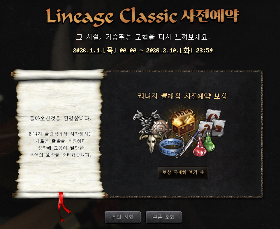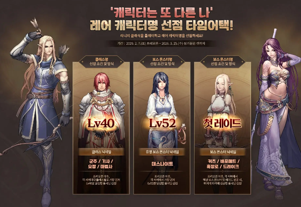리니지 클래식의 프리 오픈 일정은 2026년 2월 7일, 이후 2월 11일 정식 오픈이 예정되어 있다.